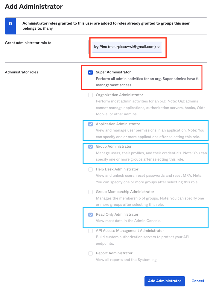 Select the administrator roles to grant: Super Administrator or a combination of Read Only + Application Admin + Group Admin.
